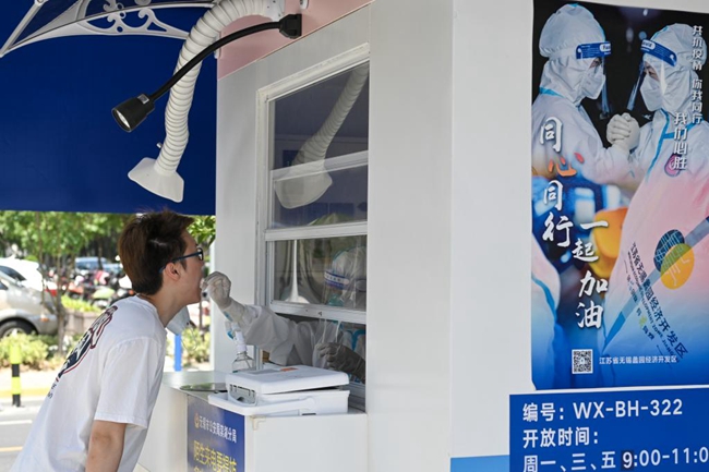 7月5日,在无锡市滨湖区蠡园街道的一处核酸采样点,一名市民在进行核酸采样。新华社记者 李博 摄