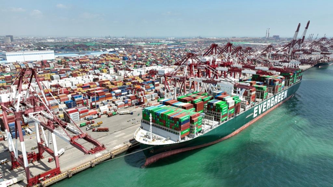 6月15日,山东港口青岛港前湾港区,集装箱货轮在码头装卸集装箱。新华社记者 李紫恒 摄