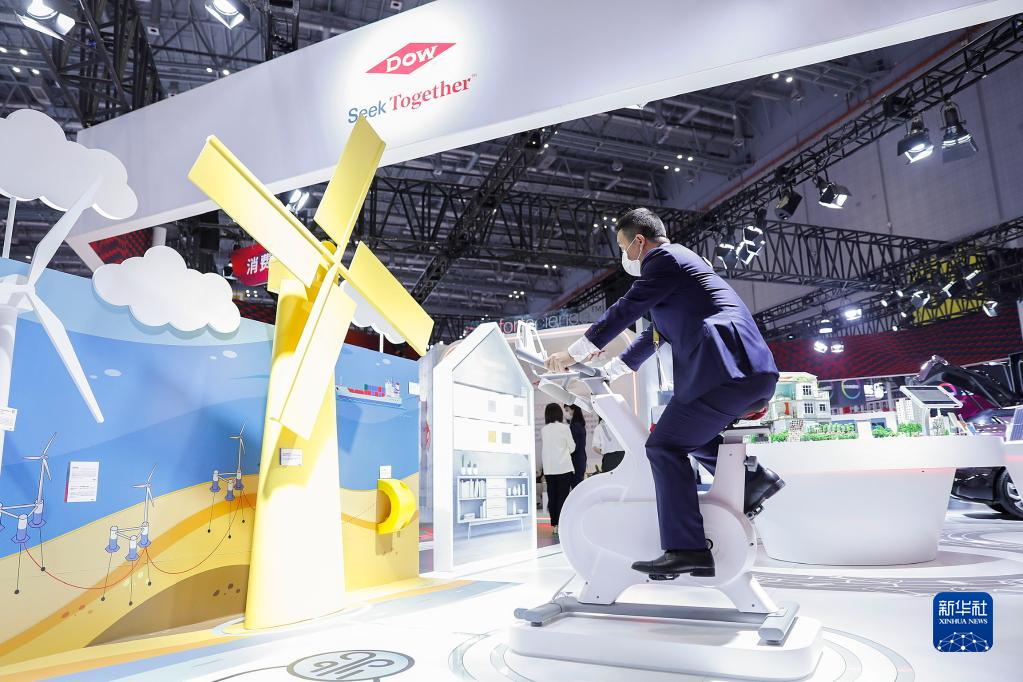 2021年11月5日,工作人员在第四届中国国际进口博览会能源低碳及环保技术专区一展台演示环保发电互动装置。新华社记者 张玉薇 摄