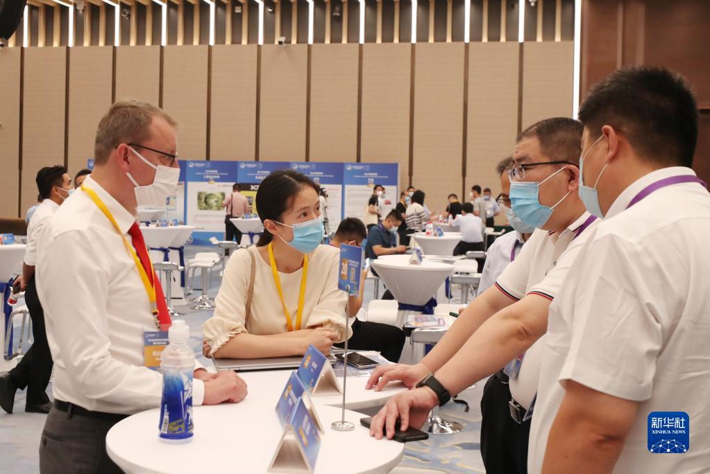 在第五届中国国际进口博览会技术装备展区展前供需对接会上,参展商代表(前左二)向采购商介绍企业产品情况(2022年8月8日摄)。新华社记者 方喆 摄