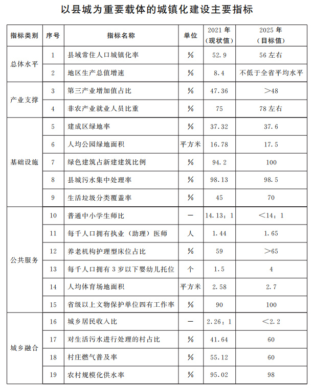 (二)发展目标。到2025年年底,以县城为重要载体的城镇化建设取得重要阶段性成果。各类型县城因地制宜,差异化、特色化高质量发展成效突出。特色优势产业发展壮大,吸纳就业能力显著增强。公共资源配置与常住人口规模基本匹配,县城短板弱项进一步补齐补强。市政设施基本完备,公共服务加快完善。人居环境更加优美,综合承载能力持续提升。农民到县城就业安家规模不断扩大,县城居民生活品质明显改善。