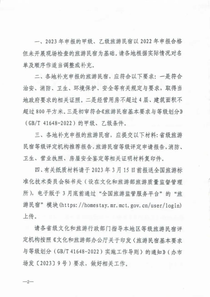 《关于申报2023年全国甲级、乙级旅游民宿的通知》