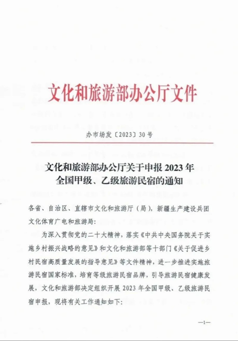 近日,文化和旅游部办公厅下发《关于申报2023年全国甲级、乙级旅游民宿的通知》,全文如下: