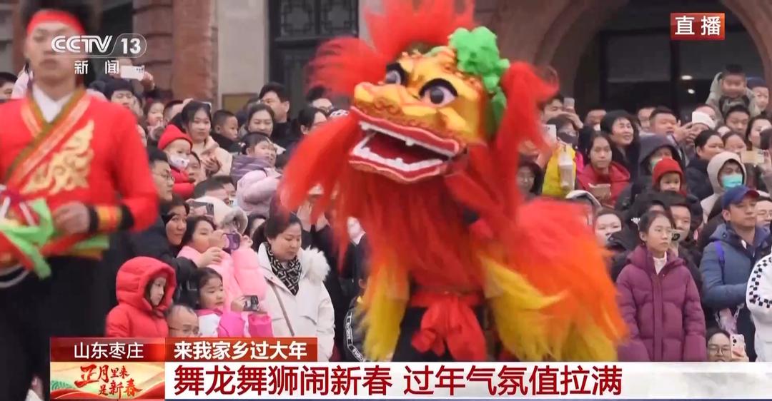 总台记者 宋文瑾:我在京杭大运河的中心点——台儿庄古城,舞龙舞狮正在精彩上演,红红火火的长龙在空中翻腾起舞,威风凛凛的狮子精神抖擞、活灵活现,浓浓的年味儿扑面而来!不远处的中幡舞狮表演,看得人热血沸腾,艺人们高超的技巧和惊人的力量引得现场叫好声不断,掌声和欢呼声响成一片。
