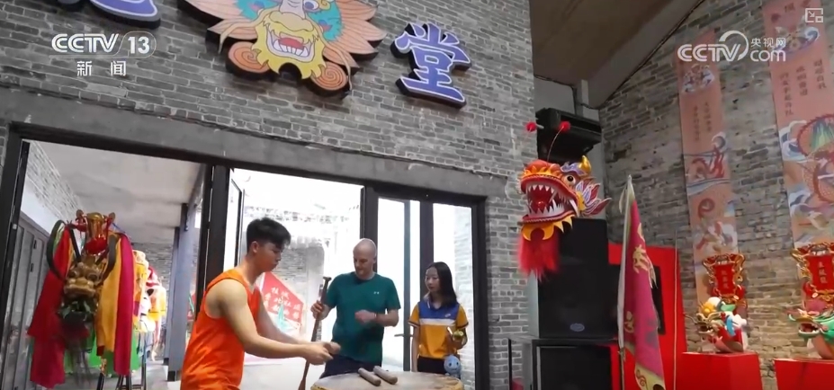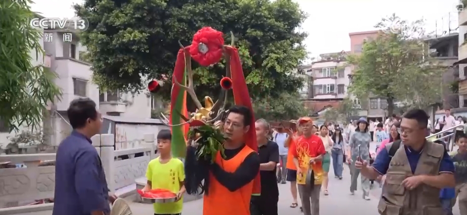 在广东佛山的一条村里,由龙舟队员举着龙头龙尾,村中叔伯挑着箩筐,敲锣打鼓穿过村里街巷,为大家送上祝福。