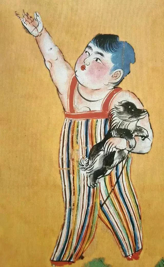 他们在玩什么呢?画面中,两个胖嘟嘟的儿童正在绿草如茵的户外玩耍嬉戏。他们头发乌黑浓密,面若桃花,上身裸露,穿蓝、白、红、黄、绿五色相间的条纹背带裤,脚蹬红鞋。左边的孩童右手高举做放飞状,左手抱一黑白相间的卷毛小狗;右边的孩童凝神注目,仿佛发现了什么,正招呼着同伴。双童形象生动,童趣盎然,逗人喜爱。