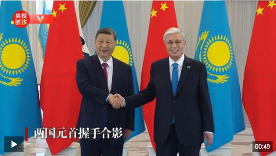 当地时间6月16日下午,国家主席习近平乘车抵达阿斯塔纳总统府,托卡耶夫总统在下车处迎接。会谈前,两国元首握手合影。