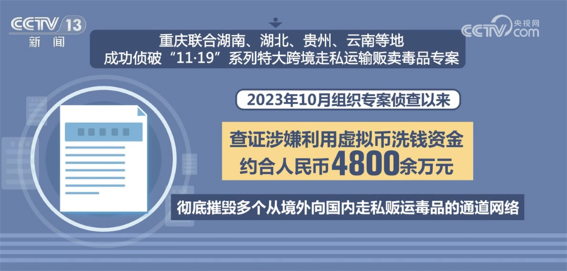 九、重庆联合湖南、湖北、贵州、云南等地成功侦破“11·19”系列特大跨境走私运输贩卖毒品专案。2023年10月组织专案侦查以来,成功串并毒品目标案件61起,带破系列案件94起,打掉涉毒团伙64个,共抓获犯罪嫌疑人327名,缴获冰毒、海洛因等毒品5.56吨,查证涉嫌利用虚拟币洗钱资金约合人民币4800余万元,彻底摧毁多个从境外向国内走私贩运毒品的通道网络。