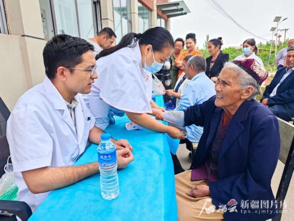 近日,阿卜杜舒库尔·麦海提(左一)为群众义诊。图/阿卜杜舒库尔·麦海提提供