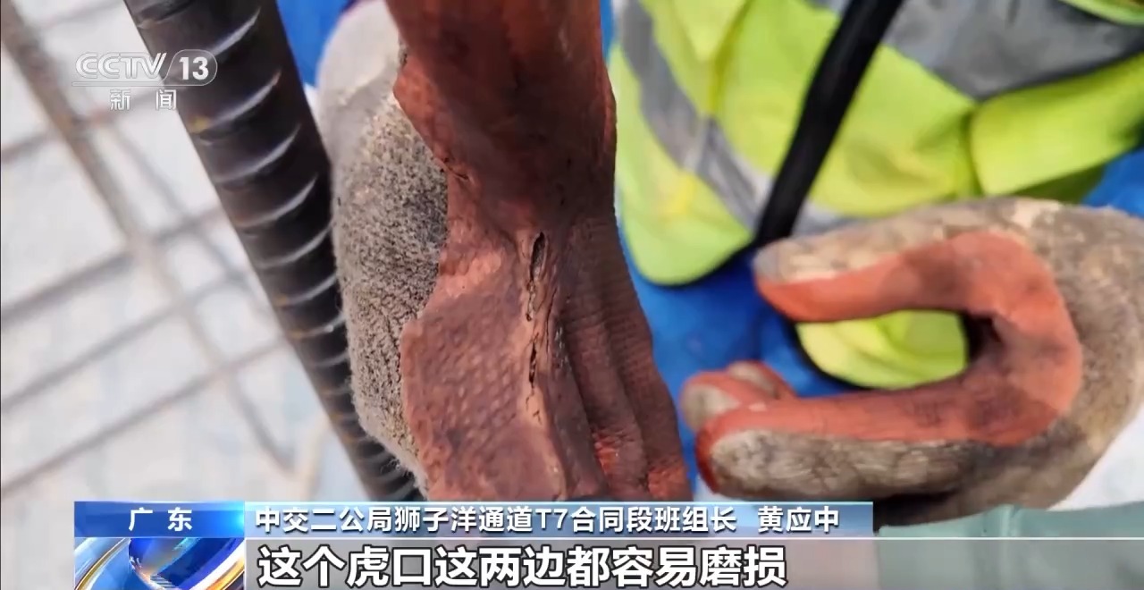 中交二公局狮子洋通道T7合同段班组长 黄应中:有点烫手,手套都已经烫化磨破了,虎口这两边都容易磨损,这个地方已经破开了,我拿胶布包了一下。