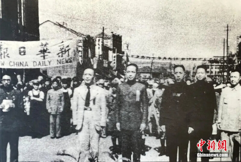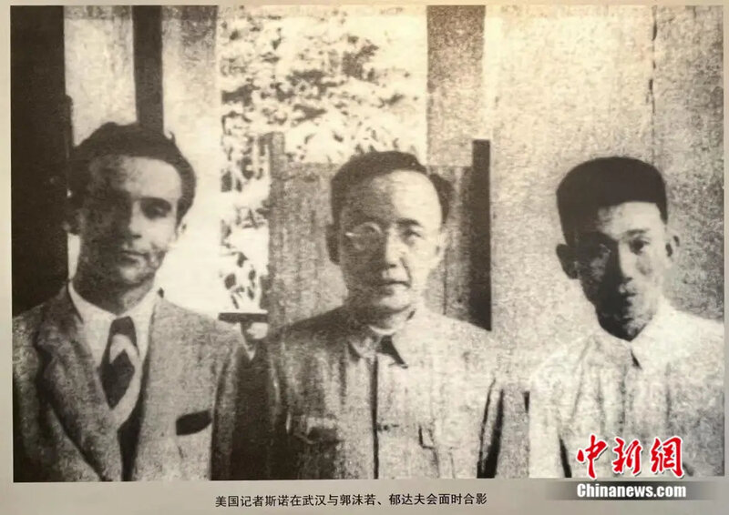 美国记者斯诺在武汉与郭沫若、郁达夫会面时合影。 (翻拍于国民政府军事委员会政治部第三厅旧址纪念馆) 张芹 摄