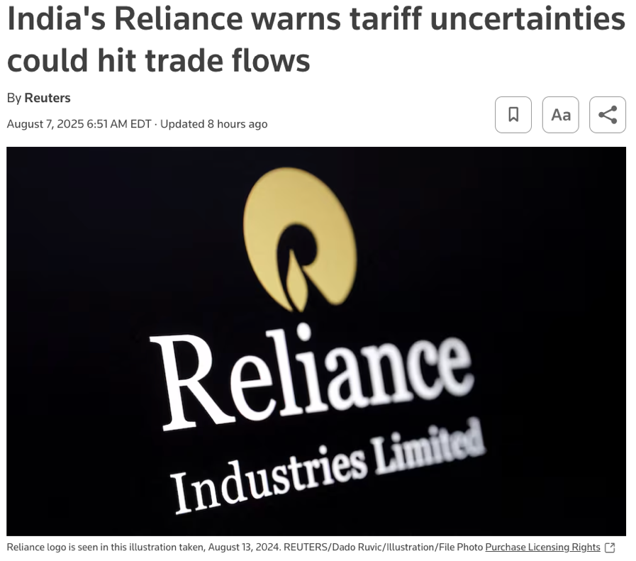 △路透社报道,印度最知名、最具影响力的跨国企业之一信实工业公司称,美国关税政策的不确定性将对国际贸易造成极大影响。