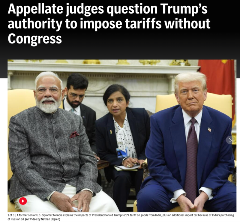 △美联社报道,美国联邦上诉法院法官对特朗普未经国会批准而征收关税的权力表示质疑。