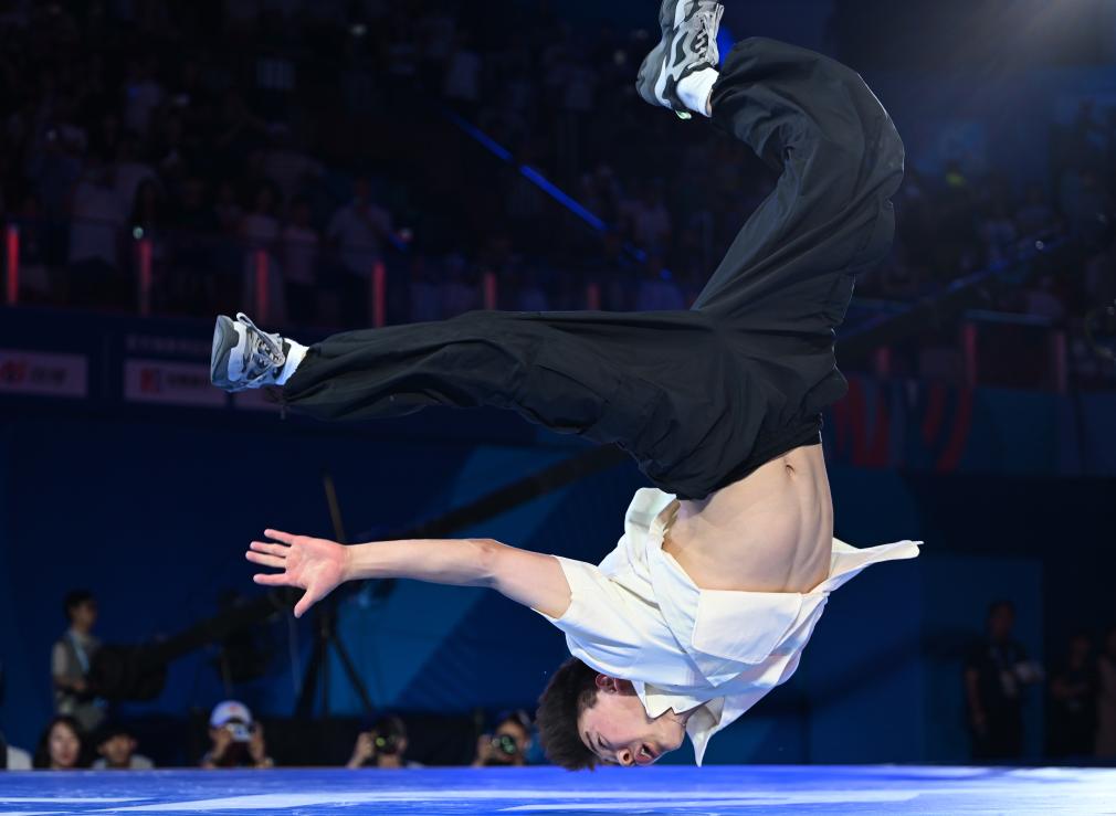 ↑中国选手亓祥宇在霹雳舞比赛中。新华社记者 李嘉南 摄