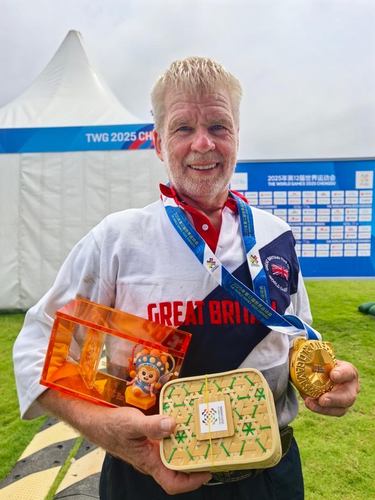 ↑英国拔河选手瑞奇·垦丁展示金牌。新华社记者 杨思琪 摄