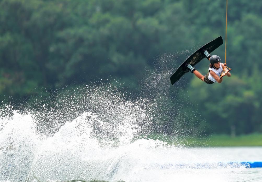↑8月9日,一名选手参加索道滑水赛。新华社记者 贝赫 摄