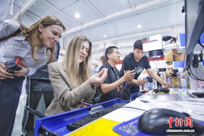7月7日,“世界市长对话·上合峰会城市”活动在天津举办。 图为天津鲁班工坊建设·体验馆内,嘉宾体验激光雕刻。 中新社记者 佟郁 摄