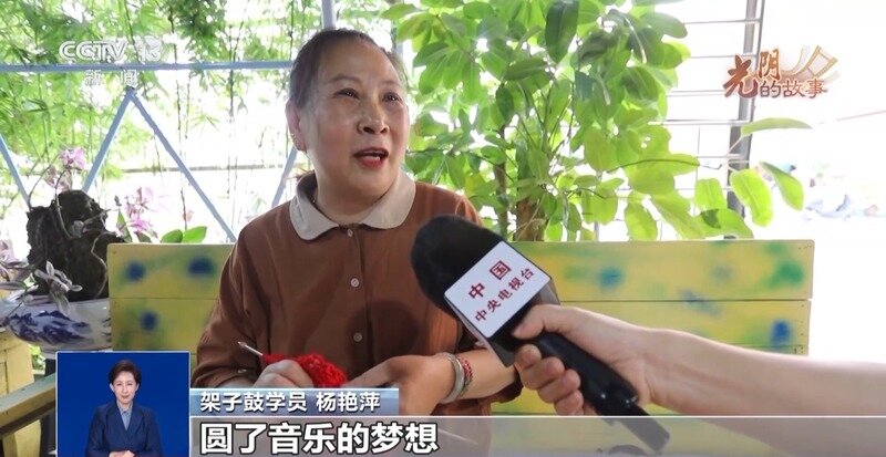 李世琪阿姨,今年76岁了,患有癌症的她,初次上课时,连手握鼓棒的力气都没有。回家后,她就对照手机里的图片,用筷子当鼓槌,拿沙发垫当鼓面,反复练习。现在,只要鼓点响起,身体的不适以及对病情的担忧都没有了。