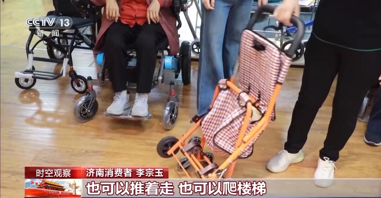 济南消费者 李宗玉:这个小车很好,功能很全,也可以推着走,也可以爬楼梯。底下还有一个兜,现在买这个小车啊,还有补贴很合适。
