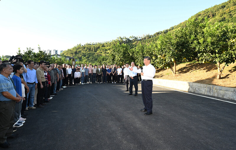 11月7日至8日,中共中央总书记、国家主席、中央军委主席习近平在广东考察。这是7日下午,习近平在梅州市梅县区雁洋镇南福金柚种植基地考察时,同村民们亲切交流。