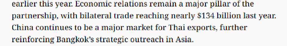 土耳其媒体YeniSafak14日报道称,此次访问正值中泰建交50周年暨“中泰友谊金色50年”。文章说,中国连续多年成为泰国最大的贸易伙伴国,经济合作是中泰全面战略合作伙伴关系的重要支柱,去年中泰双边贸易额接近1340亿美元,这不仅有助于加强和巩固泰国在地区的影响力,也有利于整个地区的经济增长和安全稳定。