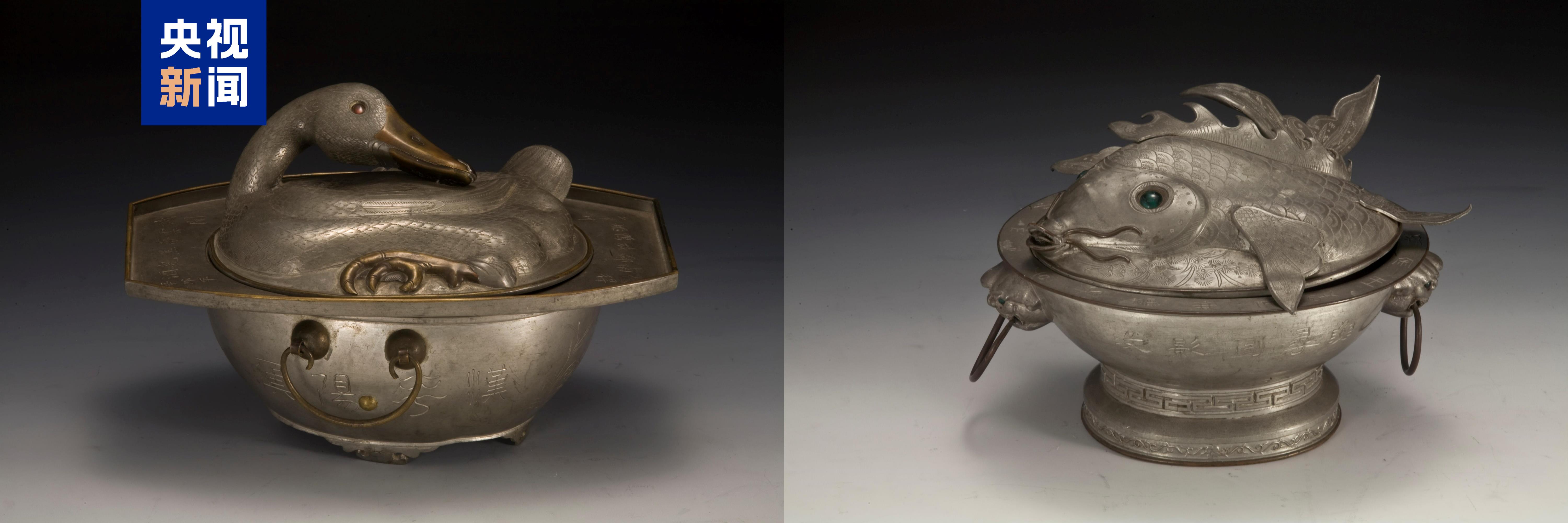 △ 清·錾刻诗文点铜鸭形锡烫锅(左)与清·錾刻诗文嵌玻璃鱼形锡烫锅