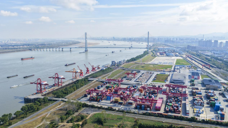 江西九江码头,江面上货轮川流不息(央广网记者 胡斐 摄)