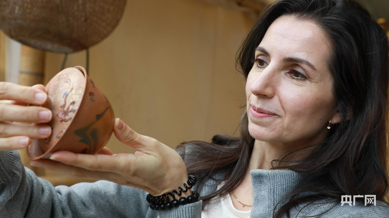 西班牙艺术家欧兰查看自己的陶艺作品(央广网记者 郇康新 摄)