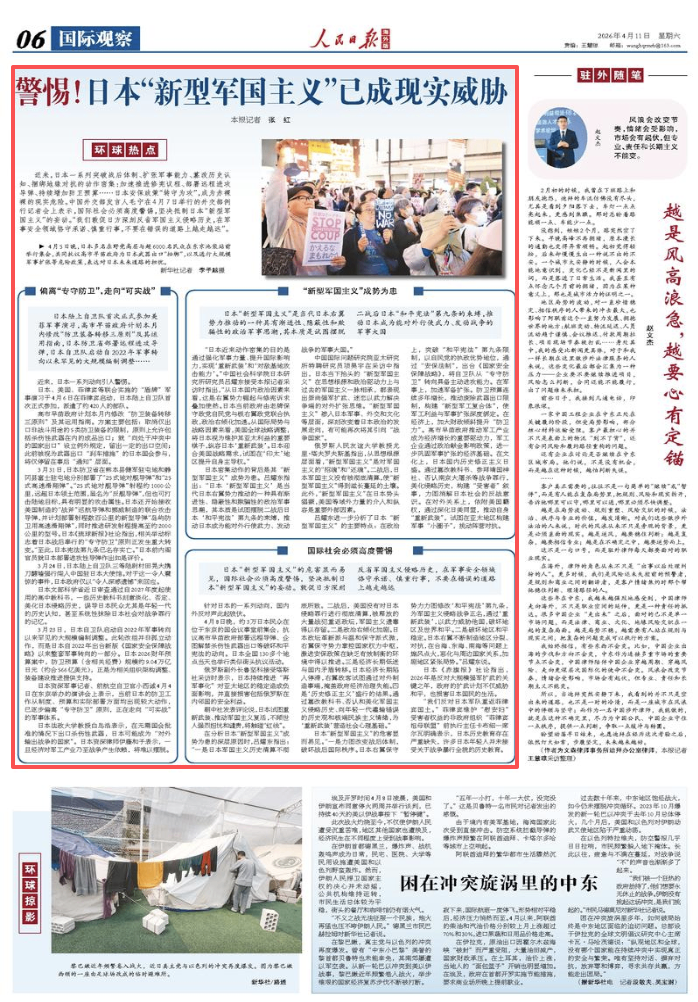 近来,日本一系列突破战后体制、扩张军事能力、篡改历史认知、捆绑地缘对抗的动作密集:加速推进修宪议程、部署远程进攻导弹、持续增加防卫预算……日本安保政策“转守为攻”,成为赤裸裸的现实危险。中国外交部发言人毛宁在4月7日举行的外交部例行记者会上表示,国际社会必须高度警惕,坚决抵制日本“新型军国主义”的妄动。“我们敦促日方深刻反省军国主义侵略历史,在军事安全领域恪守承诺、慎重行事,不要在错误的道路上越走越远”。