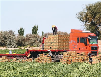 新疆维吾尔自治区哈密市伊州区南湖乡,农民在装运哈密瓜。 曹新加摄 外地客商在哈密市伊州区南湖乡地头验收哈密瓜。 曹新加摄