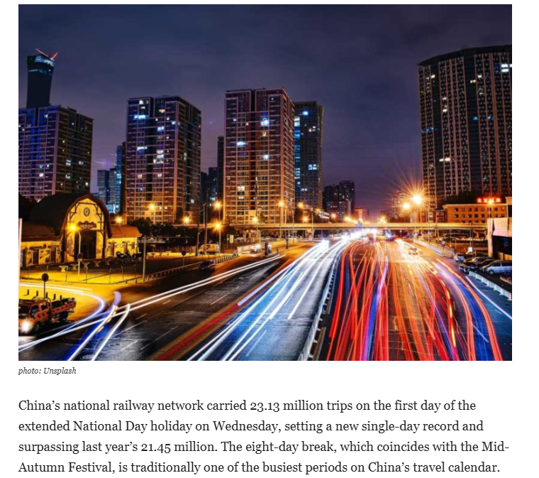 全球媒体聚焦 | 外媒:国庆假期中国旅游人数激增 高铁网络是中国旅游业的生命线