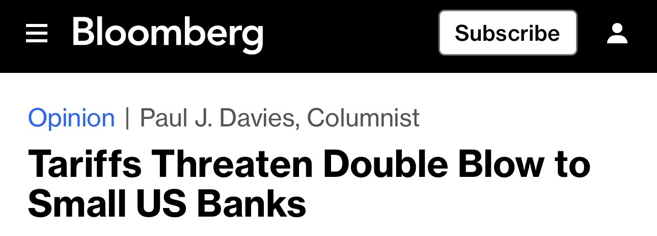 彭博社网站近日的一篇文章分析指出,关税威胁对美国小型银行造成双重打击。 彭博社网站报道截图 文章说,通货膨胀和经济增长疲软