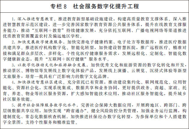 ——数字化公共服务更加普惠均等。数字基础设施广泛融入生产生活,对政务服务、公共服务、民生保障、社会治理的支撑作用进一步凸显。数字营商环境更加优化,电子政务服务水平进一步提升,网络化、数字化、智慧化的利企便民服务体系不断完善,数字鸿沟加速弥合。