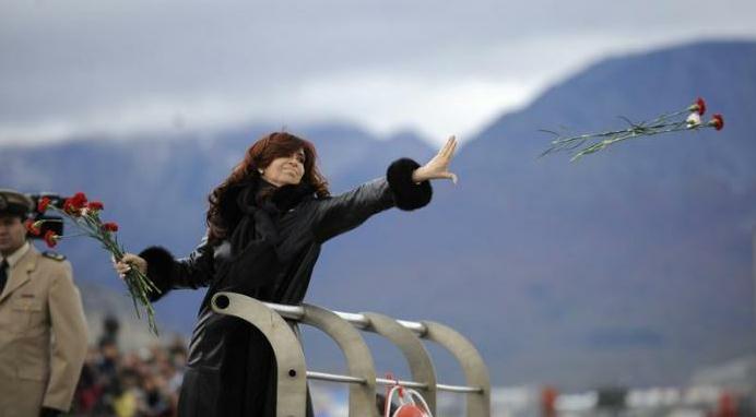 2012年4月2日,乌斯怀亚,阿根廷总统基什内尔(Cristina Fernandez de Kirchner)在向乌斯怀亚湾中扔花束,她在以这种方式向在福克兰群岛战争中阵亡的战士们致敬。