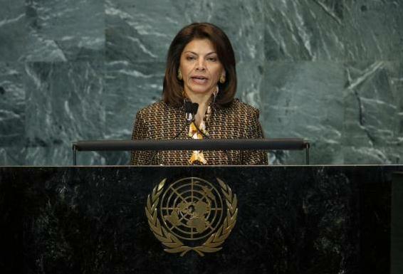 2010年9月23日,纽约联合国总部,哥斯达黎加总统劳拉.钦奇利亚.米兰达在第65届联合国大会上致辞。