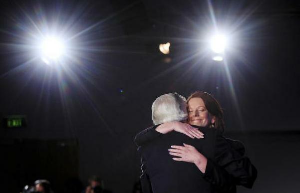2010年8月16日,在布里斯班举行的工党联邦竞选活动中,澳大利亚总理朱丽亚吉拉德与前总理霍克拥抱。