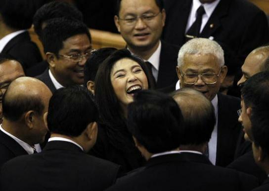 2011年8月5日,曼谷,泰国议会选举新一任总理,来自为泰党的唯一候选人英拉西那瓦不负众望,成功当选为泰国第二十八任总理,其也成为泰国历史上首位女总理。图为胜选后,英拉同为泰党的成员们在欢呼庆贺。