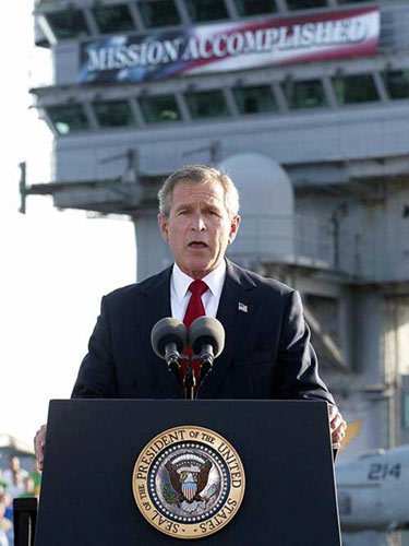 资料图片:2003年5月1日,布什总统站在美国海军“林肯”号航空母舰甲板上宣布:“伊拉克主要作战任务行动已经结束。”布什身后悬挂着一面红、白、蓝三色相间的横幅,上面写着“任务完成”的标语,后来成为巨大的讽刺与笑柄。