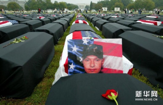 这是2004年10月2日,在美国华盛顿白宫前的大草坪上,一名阵亡美军士兵的照片摆放在1000多具模拟棺材中间。一些民间组织和驻伊美军亲属当天在白宫前举行悼亡集会,悼念在伊拉克战争中死亡的美军将士,并强烈要求布什政府立即从伊拉克撤军。 新华社记者吕明响摄