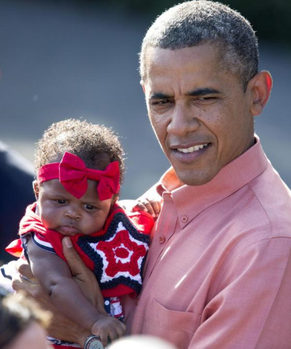 参加白宫独立日活动的奥巴马抱着一位宝宝以示亲民,可惜这位宝宝似乎对这位“蜀黎”不是很满意