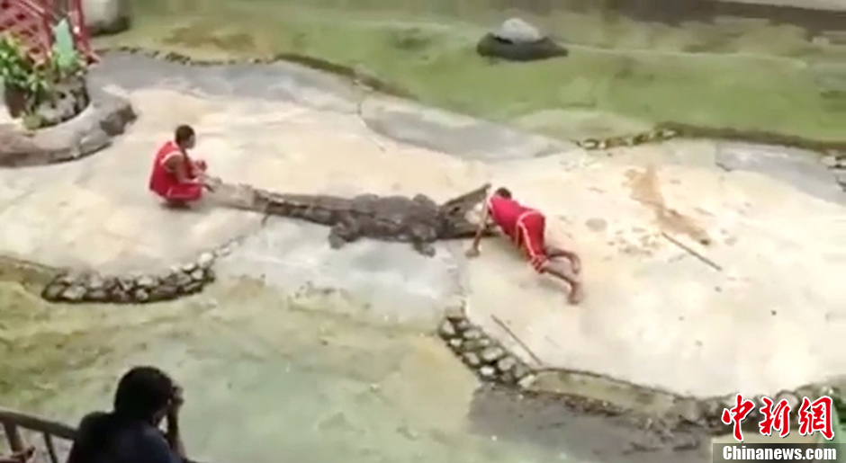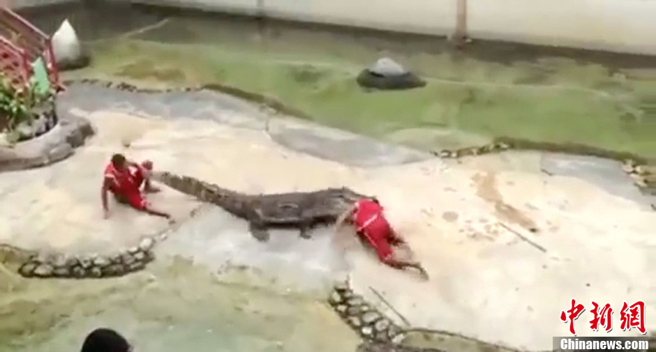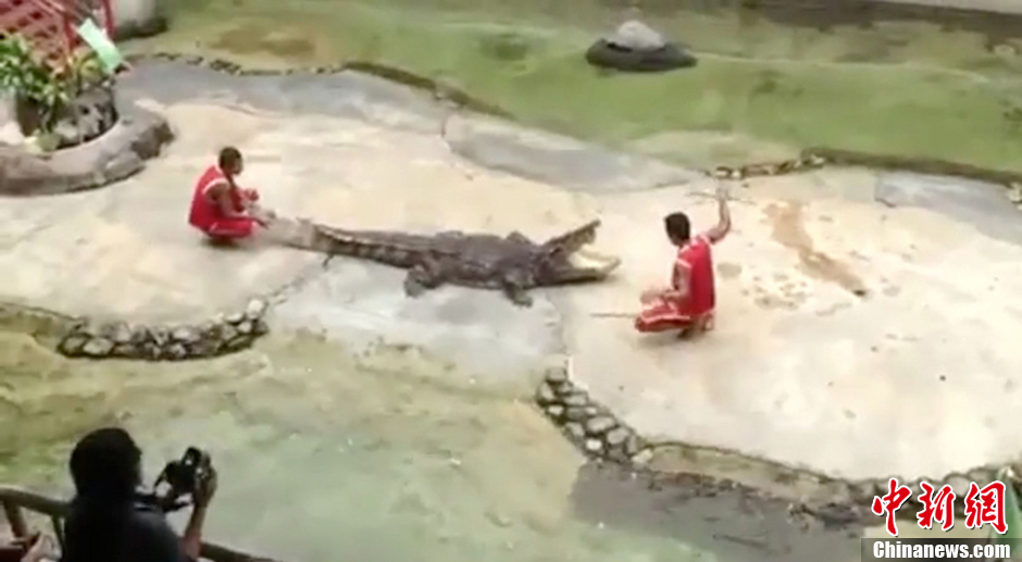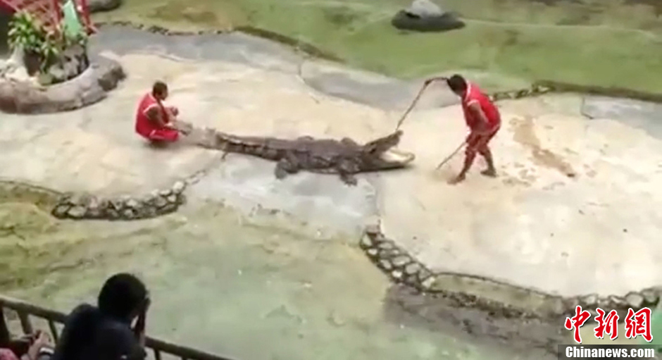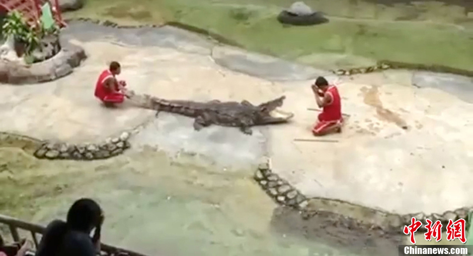 泰国鳄鱼表演失控 驯兽师鳄口逃生