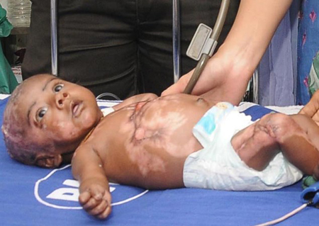 报道称,这名男婴名叫拉胡尔(Rahul),出生在印度廷迪瓦南村。他在9天大的时候身体第一次起火。据印度CNN-IBN电视台报道,拉胡尔很可能正在遭遇“人体自燃”(SHC),他皮肤毛孔中分泌的气体有可能是起火原因。