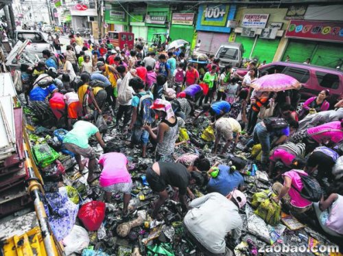 据报道,超强台风“海燕”本月8日凌晨重创菲律宾中部后,重灾区之一的莱特省塔克洛班市物资极其匮乏,一家杂货店把遭风灾破坏的物品丢弃到店外时,竟然吸引了许多灾民前来竞相寻找值钱的东西。