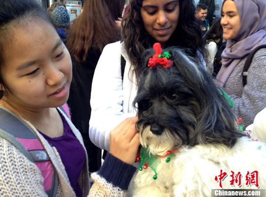 曼蒂的主人吉妮?蒂尔沃斯为她穿上红绿相间的圣诞节服饰。蒂尔沃斯告诉中新社记者,“我1969年从这里毕业,总想着要为母校做点事情。我也经历过考试前的紧张,带曼蒂来安抚学生太合适了,你看,他们多高兴。”
