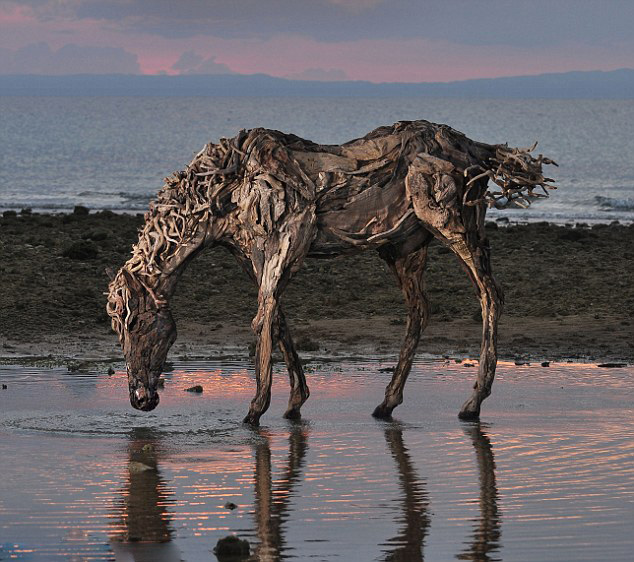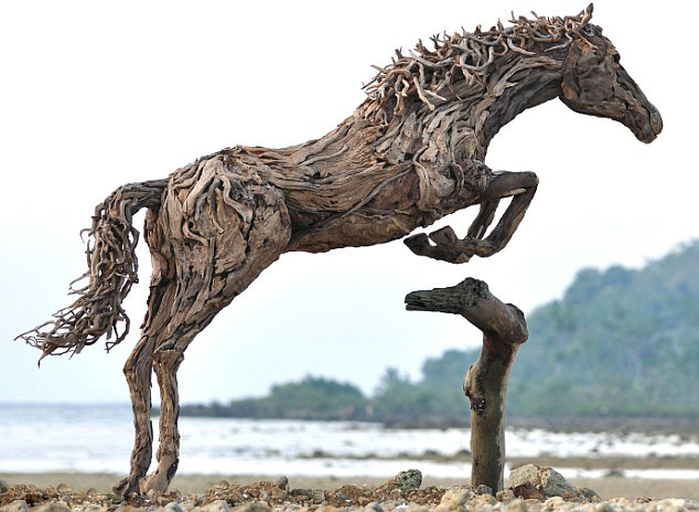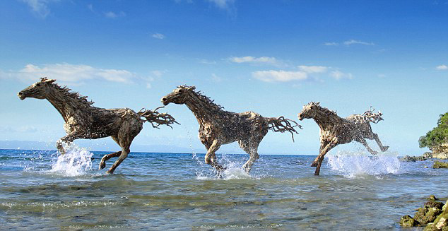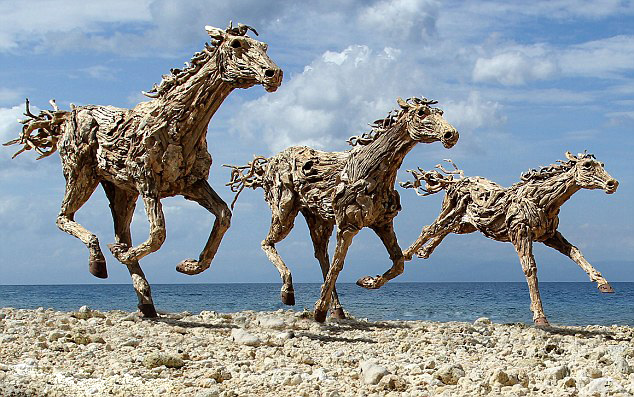 【环球网综合报道】2014年中国农历新年将至,全球友人纷纷向即将到来的中国农历骏马之年献礼。据英国《每日邮报》1月15日报道,英国伯明翰能工巧匠詹姆士·多兰·韦伯(James Doran-Webb)利用从海滩上捡拾的漂浮木,耗时6个月,制造出三匹形象逼真的骏马木雕。