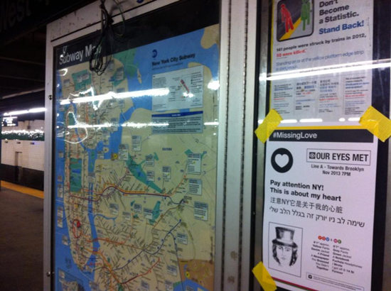 女艺术家在地铁站里贴出海报,寻找一名在她搭乘地铁时一见钟情的男子。