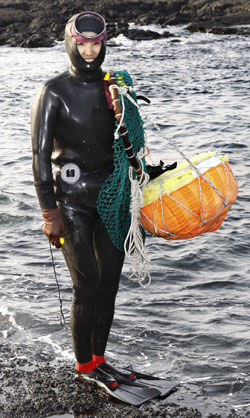 海女研究专家韩林华(音)表示“潜水方法有根本不同”。在日本,男性也是海女文化的一部分。 而济州岛海女则完全是女性文化。过去男性也曾参与过潜水。但因无法承受朝鲜朝廷过度地水产进贡要求,从而逐渐消失。