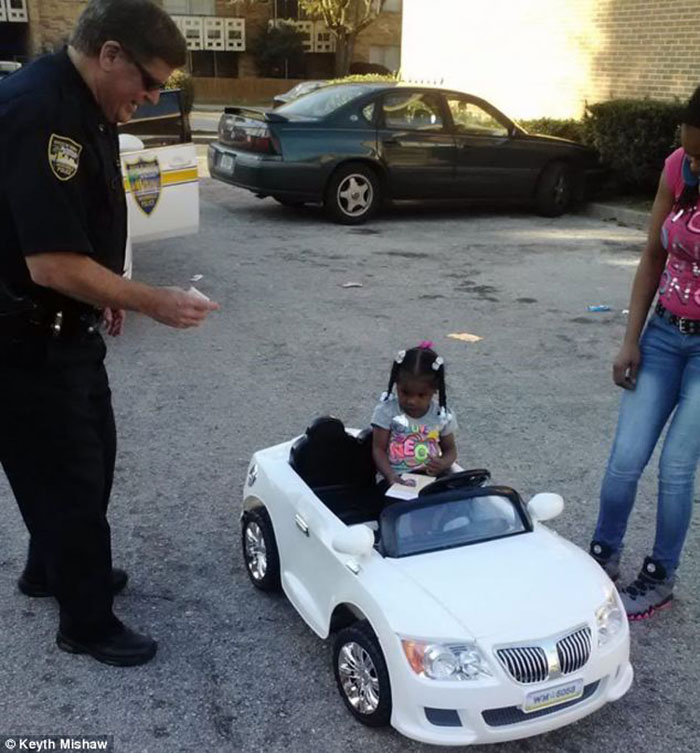 报道称,当天,小米肖正开着自己的“爱车”在公寓大楼外“飞驰”,警察贝拉斯科(Christian Velasco)开着闪着蓝灯的警车尾随米肖至家门口。贝拉斯科下车后,掏出罚款单,在上面写着因为超速将罚款4美元,然后将单子递给还在玩具车中的小米肖。米肖的叔叔(Keyth Mishaw)赶紧用快门记录下这滑稽又温馨的一幕。