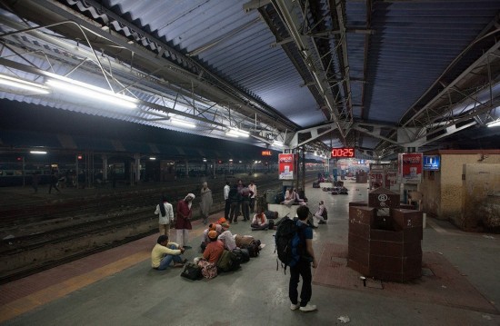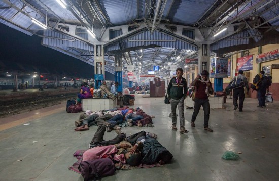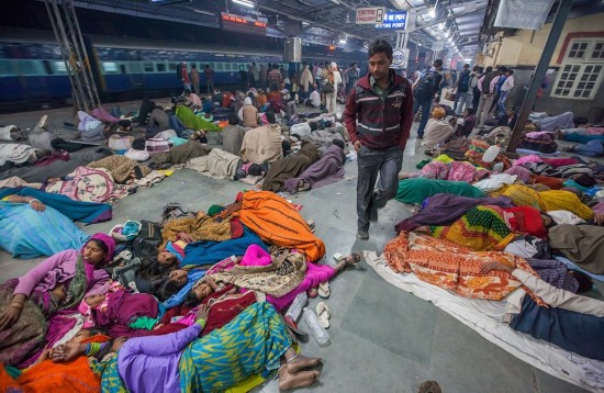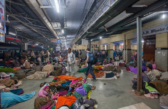 印度火车站则又是另一幅景象,通常有很多人睡在这里,所以经常要叫醒熟睡的人以便顺利通过。