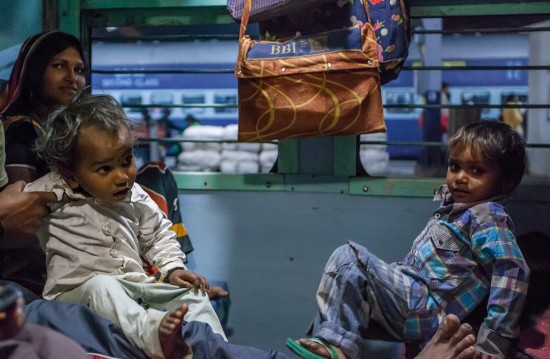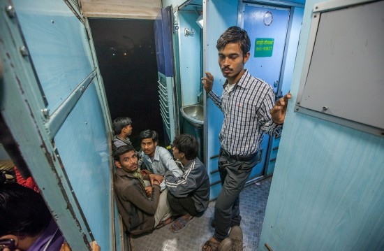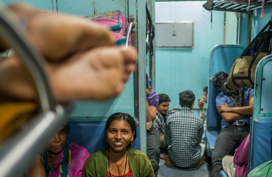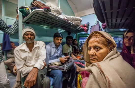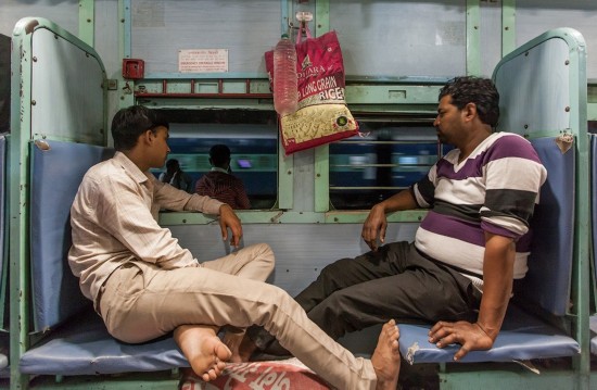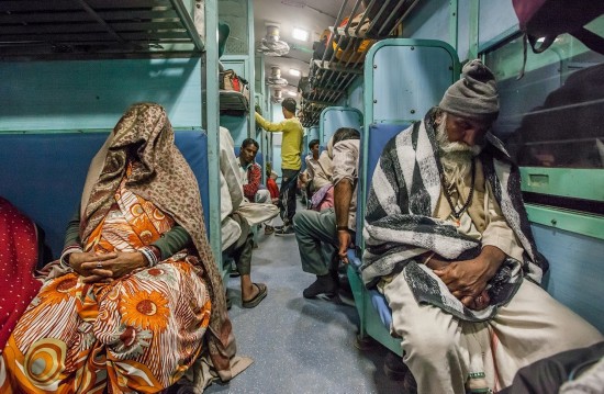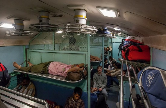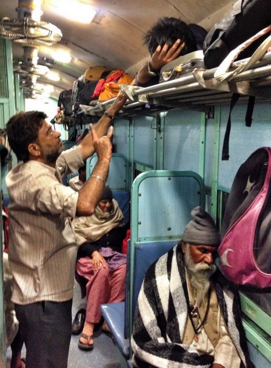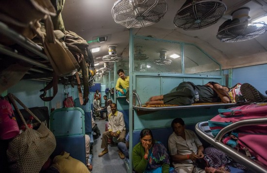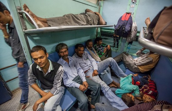 印度公共车厢往往十分拥挤,所有的座位、上面的架子、车厢间的连廊、甚至厕所都挤满了人。甚至还有乘客直接挂在车门上。本来只有3人座位大小的下铺通常会有5、6个人坐着。几乎每个车厢地板上都有人躺着睡觉。车厢里很闷热,没有窗户,只有栏杆,天花板下面是坏了的电风扇。火车经过森林带时,很多蝴蝶和蜻蜓会飞进车厢,带进一阵阵凉风。